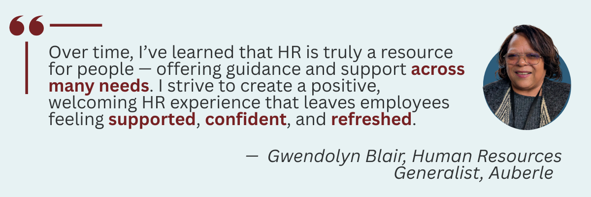A: Early in my career, I didn’t fully understand the role of Human Resources. Over time, I learned that HR is truly a resource for people—offering guidance and support across many needs. I strive to create a positive, welcoming HR experience that leaves employees feeling supported, confident, and refreshed.