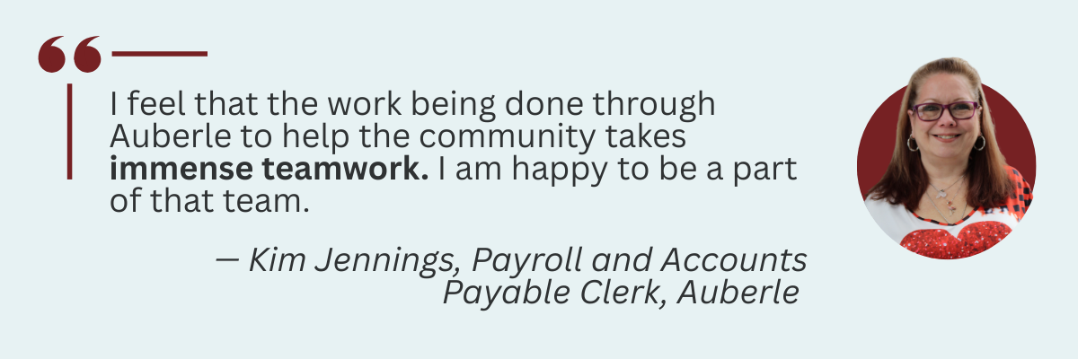 A: I feel that the work being done through Auberle to help the community takes immense teamwork and I am happy to be a part of that team. I don’t interact with the clients, but I do get to interact with the staff that is out in the field working, and I hope I make their jobs just a little bit easier.