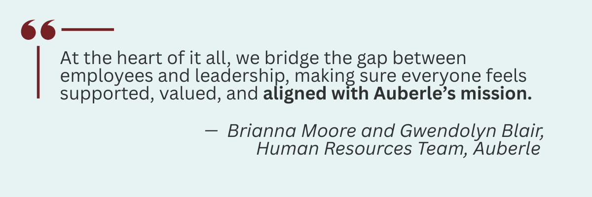 A: We’re dedicated to creating a workplace where every employee feels empowered and supported. Through transparency, trust, and consistent guidance, our HR team helps staff thrive throughout their journey at Auberle.